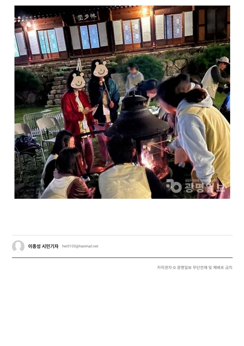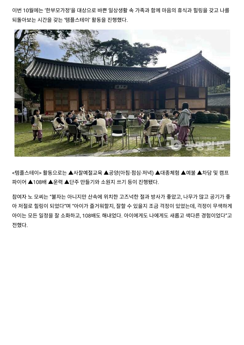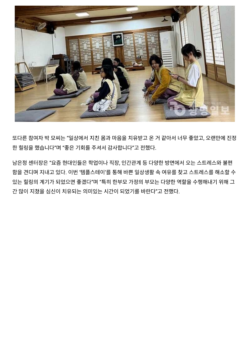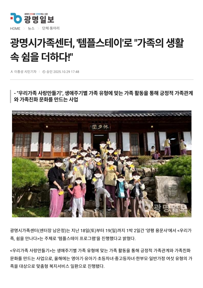 ±¤¸í½Ã°¡Á·¼¾ÅÍ(¼¾ÅÍÀå ³²ÀºÁ¤)´Â Áö³ 10¿ù 18ÀϺÎÅÍ 19ÀϱîÁö 1¹Ú 2Àϰ£ ¾çÆò ¿ë¹®»ç¿¡¼ <¿ì¸®°¡Á·, ½°À» ¸¸³ª´Ù>¶ó´Â ÁÖÁ¦·Î 'ÅÛÇýºÅ×ÀÌ' ÇÁ·Î±×·¥À» ÁøÇàÇßÀ¸¸ç, º¸µµÀڷḦ °øÀ¯µå¸³´Ï´Ù.