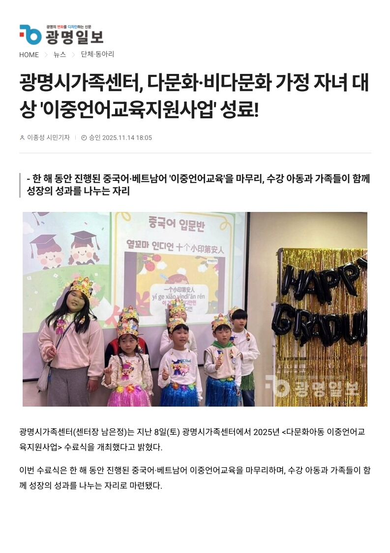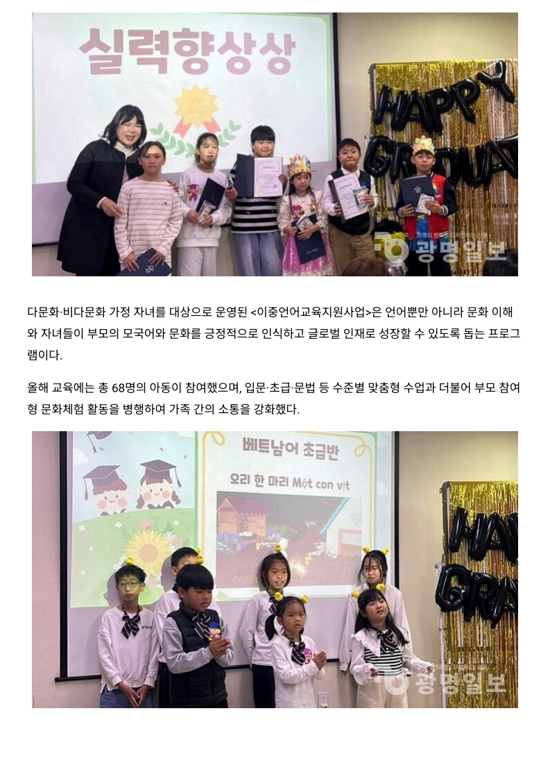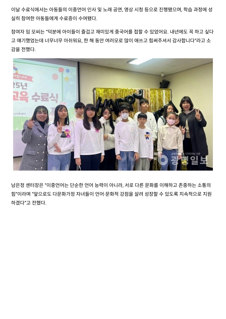 ±¤¸í½Ã°¡Á·¼¾ÅÍ(¼¾ÅÍÀå ³²ÀºÁ¤)´Â Áö³ 11¿ù 8ÀÏ(Åä) ´Ù¹®È-ºñ´Ù¹®È °¡Á¤ Àڳฦ ´ë»óÀ¸·Î ¿î¿µÇÑ 'ÀÌÁß¾ð¾î±³À°' ¼ö·á½ÄÀ»