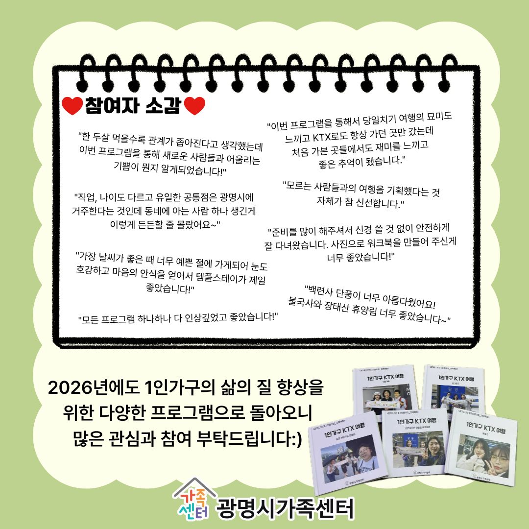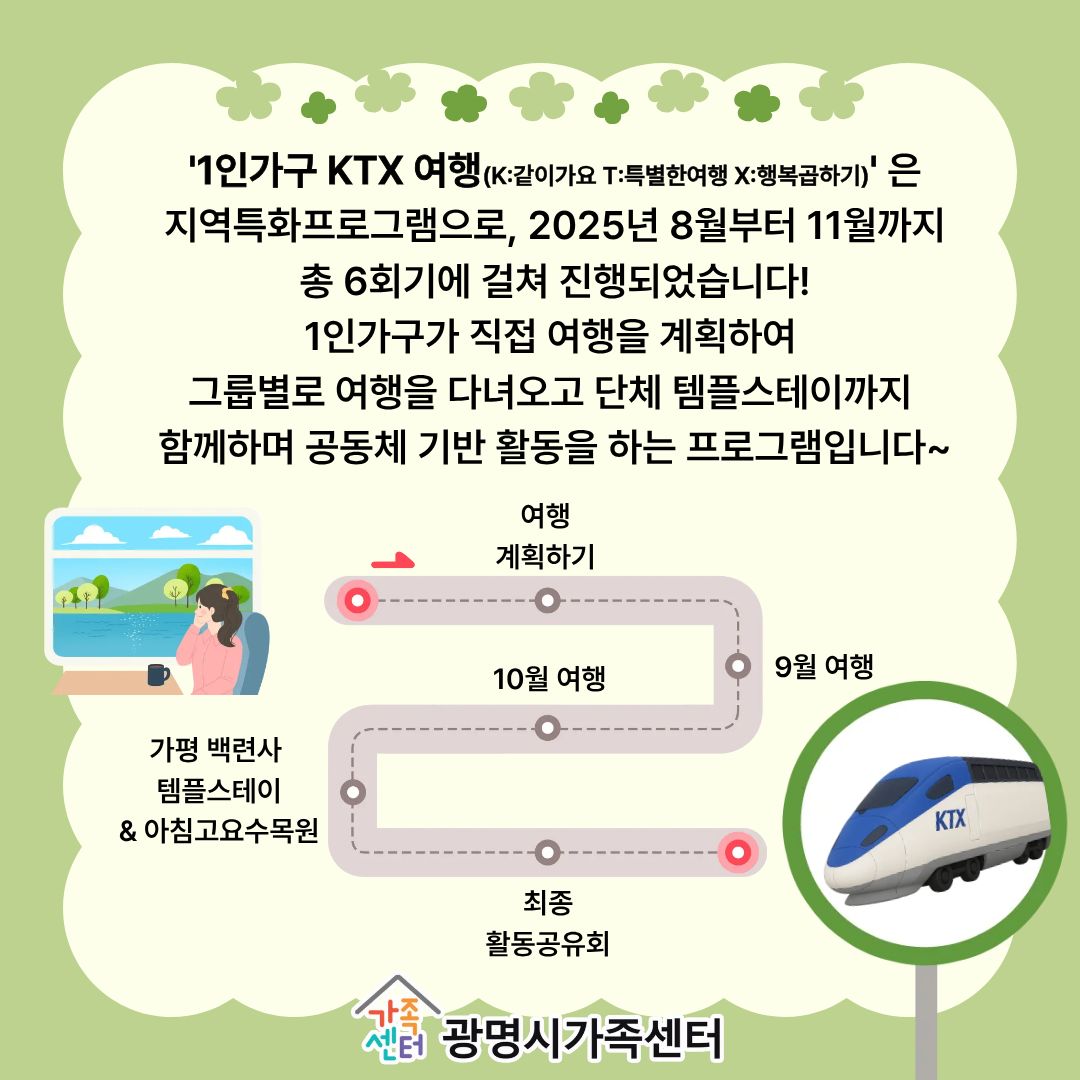 ±¤¸í½Ã°¡Á·¼¾ÅÍ¿¡¼­ 8¿ùºÎÅÍ 11¿ù±îÁö '1Àΰ¡±¸ KTX ¿©Çà' ÇÁ·Î±×·¥À» ÁøÇàÇß½À´Ï´Ù!